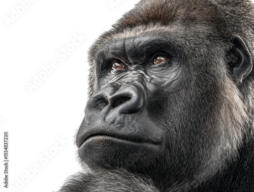 A close-up portrait of a formidable gorilla, his intelligent eyes hold a contemplative gaze.