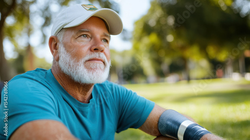 A close-up portrait of a veteran with a prosthetic limb, sitting quietly in a memorial park.