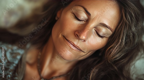 A close-up portrait of a woman with long, wavy brown hair and a serene expression.