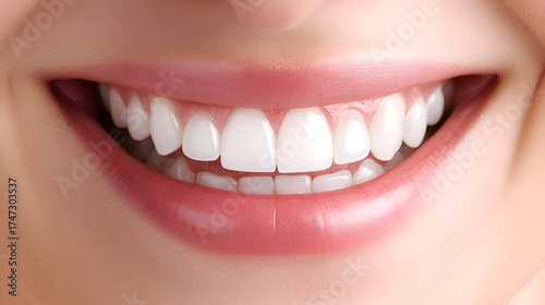 A close-up portrait of a young woman with a radiant smile, highlighting her perfect white teeth. The soft, natural lighting enhances her joyful expression
