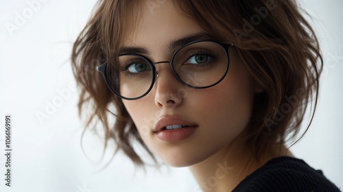 A close-up portrait of a young woman with brown hair wearing round black framed glasses. Her green eyes gaze directly at the camera.