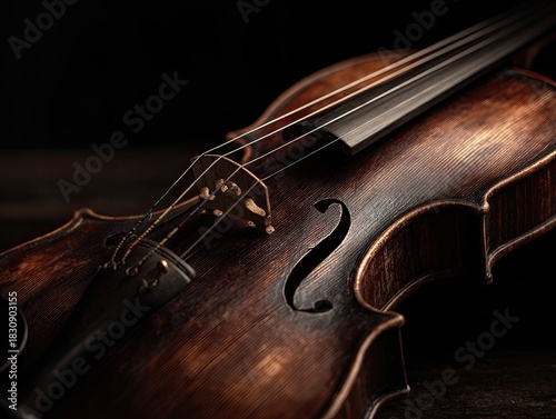 A close-up shot captures a finely crafted wooden violin, showcasing its details