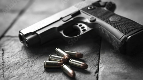 A close-up shot of a black handgun and brass bullets on a textured surface, symbolizing themes of security and danger.