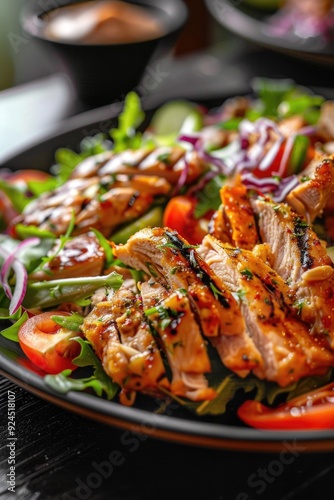 A close-up shot of a black plate topped with various meats and vegetables