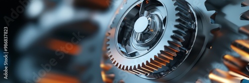A close-up shot of a metallic gear, showcasing the intricate details of its design. The gear represents precision engineering, complex machinery, and the seamless integration of moving parts.