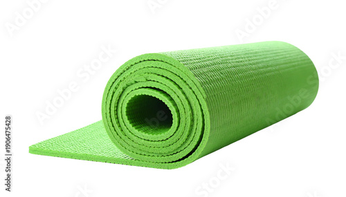 A close-up shot of a partially unrolled, vibrant green exercise mat, isolated against a solid black background. The mat is textured and rolled