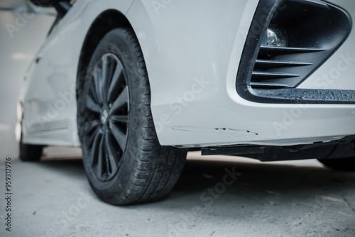 A close-up shot of a scratched sedan highlights the imperfections on its surface, with deep scratches and scuffs on the paint, revealing the wear and tear from frequent use.