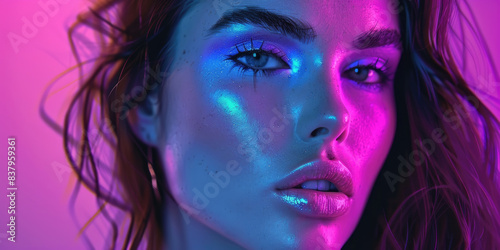 A close-up shot of a womans face illuminated by blue and pink neon lights. Her dark hair flows around her face, and her eyes are closed
