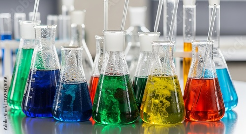 A close-up shot of numerous laboratory Erlenmeyer flasks filled with brightly colored liquids reacting during a vibrant chemical experiment in a brightly lit scientific environment