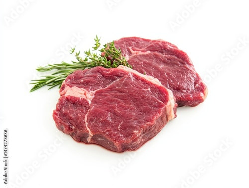 A close-up shot of raw, red steaks, artistically arranged with sprigs of herbs. It evokes a sense of fresh ingredients and culinary anticipation.