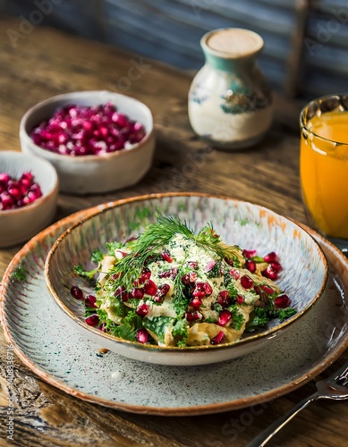 A close-up shot of salad hinted with pomegranate seeds on an authentic plate, its delicate.