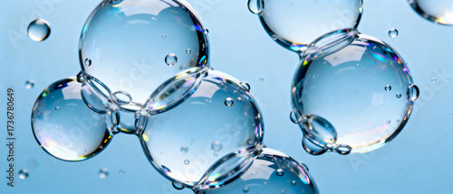 A close-up shot showing several transparent bubbles with light reflections and glossy surfaces floating in the air.