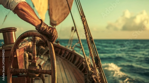 A closeup shot shows a man, presumably the captain of the ship, with his hand firmly on the wooden wheel of the helm, as waves crash in the ocean and the sun sets behind him, highlighting his role as