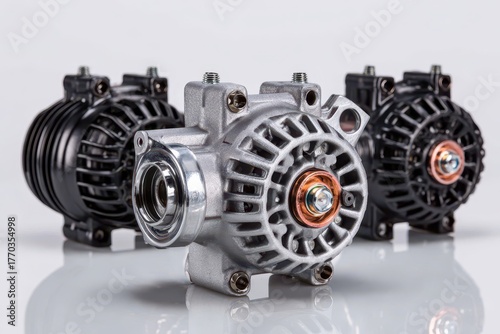 A close-up studio shot of three new automotive alternators, showcasing intricate details, metal finish, and electrical components, highlighting engineering precision.