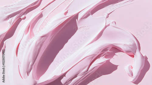 a close-up, top-down view of milky pink emulsion paint filled entire frame, focusing on the calm, undisturbed surface of the paint