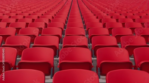 A close-up view captures the continuous rows of empty, bright red stadium seats receding into the background.