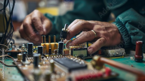 A close-up view captures workers assembling electronic components.