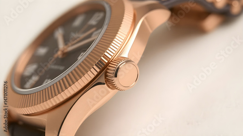 A close-up view highlights the detailed features of a luxury wristwatch with a shiny rose gold case