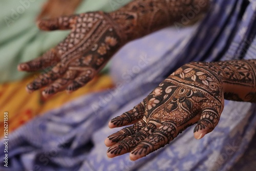 A close-up view of a girl's hands adorned with intricate mehndi (henna) designs, a traditional Indian body art often applied during weddings, festivals, and celebrations.