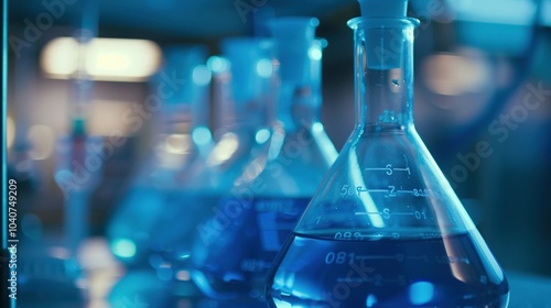 A Close-up View of a Glass Erlenmeyer Flask Filled with Blue Liquid in a Lab Setting
