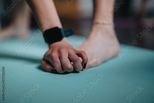 A close-up view of a hand pressing on a yoga mat alongside a bare foot, emphasizing focus and grounding during a relaxing yoga or fitness session.