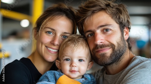 A close-up view of a joyous family with parents and their young child, capturing a moment of love, contentment, and togetherness in a warm setting.