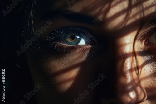 A close-up view of a person's eye with a shadow. This image can be used to depict mystery or intrigue.
