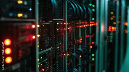A close-up view of a server rack with illuminated indicators showing operational status.