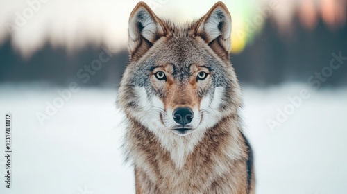 A close-up view of a wolf's face, showcasing its intense gaze and thick fur against a snowy background.