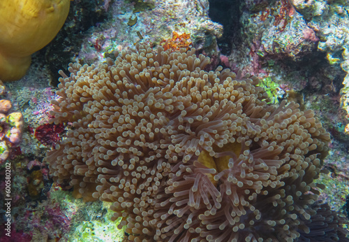 A closeup view of Anemone with Brown color. Beautiful Anemone underwater.