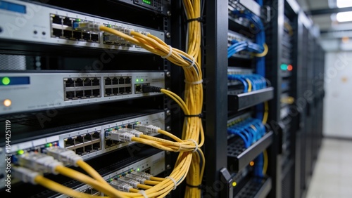 A close-up view of network servers with multiple cables connected. The scene showcases a modern data center environment with organized equipment.