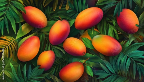 A close-up view of ripe mangoes with green leaves.