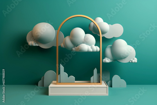 A cloud in front of a golden frame on a green background