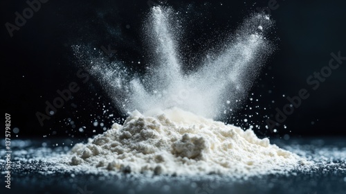 A cloud of flour bursts from a mound, creating an artistic splash against a dark background, highlighting texture and movement.