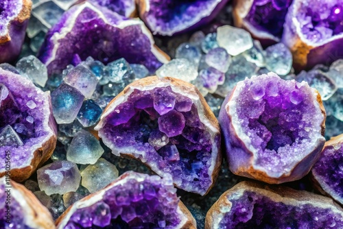 A cluster of amethyst geodes with indigo drips and mineral deposits, indigo, geode, natural wonders