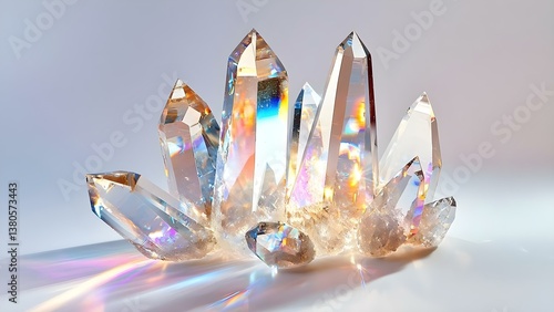 A cluster of clear quartz crystals with a reflective surface, displaying various colors and light refractions. Concept Clear Quartz Cluster, Reflective Surface, Light Refractions, Color Variations