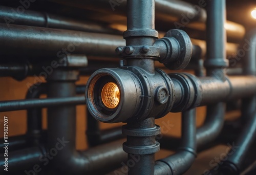A cluster of pipes with a beautiful sunset painting the sky behind