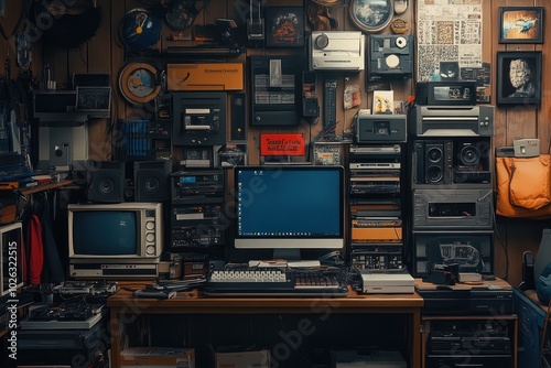 A cluttered workspace with a computer monitor, keyboard, and vintage electronics on a wooden desk, with a wall covered in posters, photos, and gadgets.