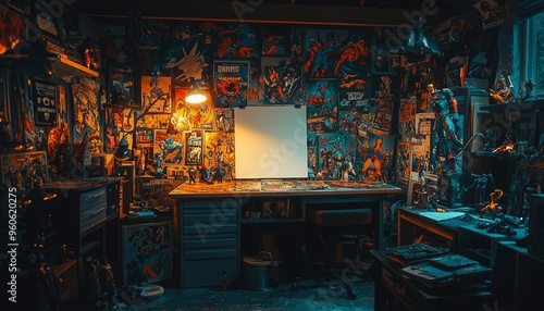 A cluttered workspace with a desk, chair, and shelves filled with comic books and figurines.