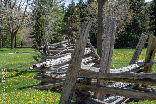 A collapsing old wooden fence in the field of green grass and yellow dandelions in spring.
