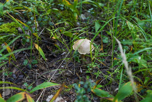 A collar cap mushroom (Rozites caperatus) grows amidst tall grass and greenery in a damp, mossy forest. Natural, serene scene with rich vegetation, suitable for botanical studies or nature photography