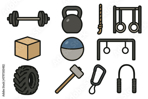 a collection of 12 colorful icons representing various fitness and strength training equipment.
