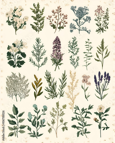 A collection of 20 illustrated botanical plants with white backgrounds.