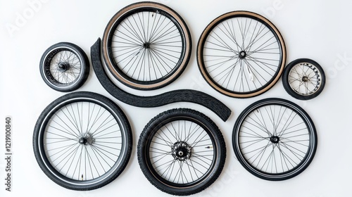 A collection of bicycle wheels with spokes and tires on a white isolated background