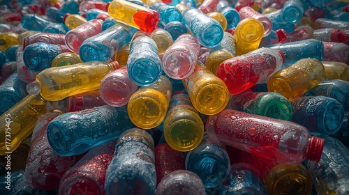 a collection of colorful plastic bottles. The bottles are of different colors and are scattered around