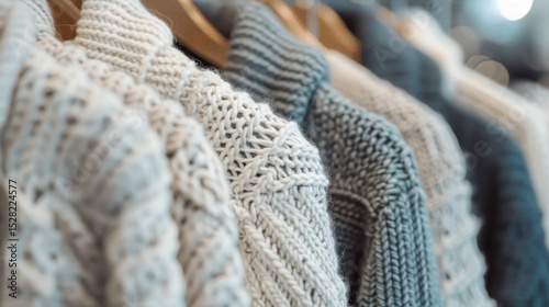 A collection of cozy knitted sweaters hanging on a wooden rack, showcasing a range of textures and warmth, perfect for fall or winter fashion enthusiasts and lovers of handmade crafts.