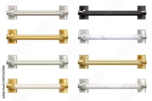 A collection of eight towel bars in various colors and materials including silver, gold, and black, displayed against a transparent background on transparent background