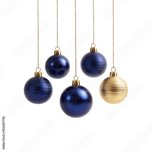 A collection of elegant blue and gold Christmas ornaments hanging gracefully against a white background.