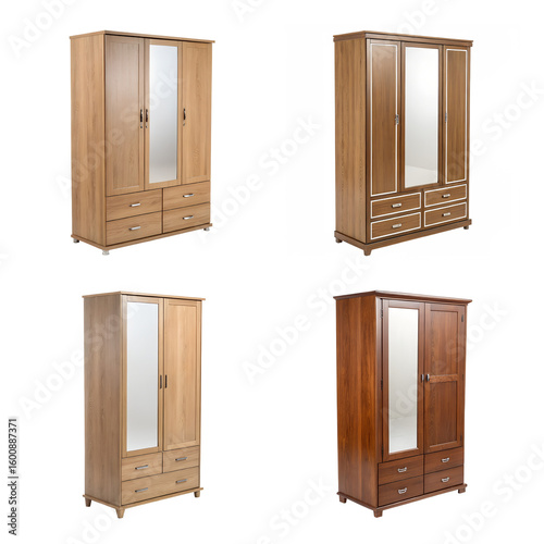 A collection of four wooden wardrobes with mirrored doors and drawers showcasing different styles and wood finishes