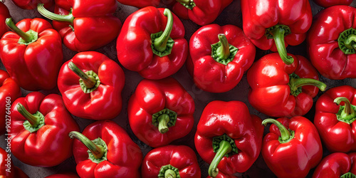 A collection of fresh, shiny red bell peppers displayed closely together, highlighting their vibrant color and texture.